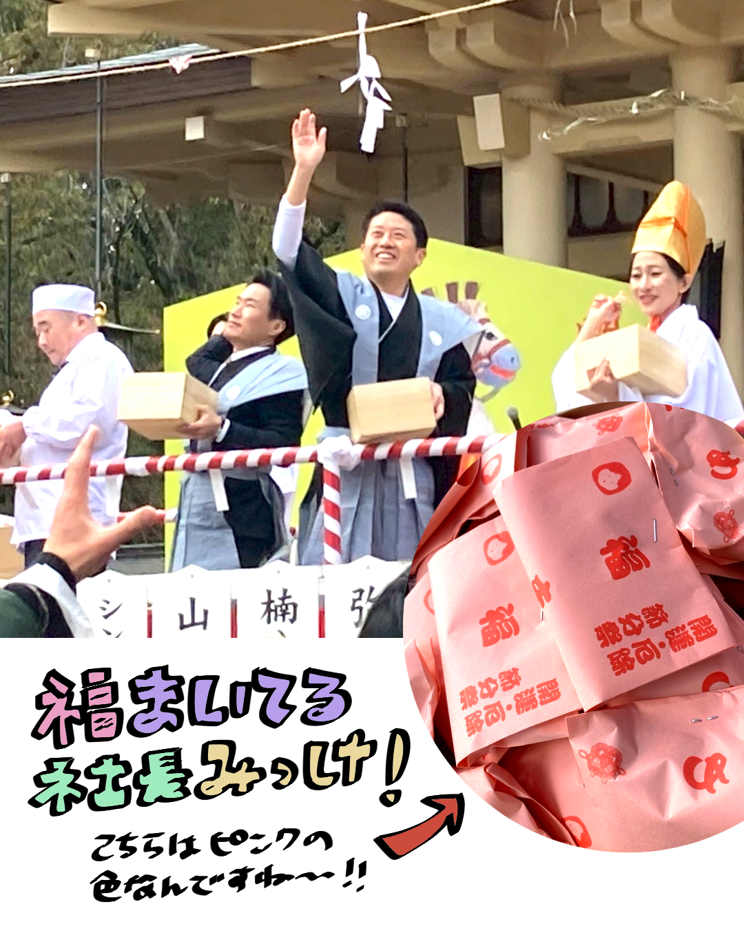 なお、節分当日にはこれまた毎年恒例の豆まき神事があります。境内の特設舞台から福豆がばらまかれます!!