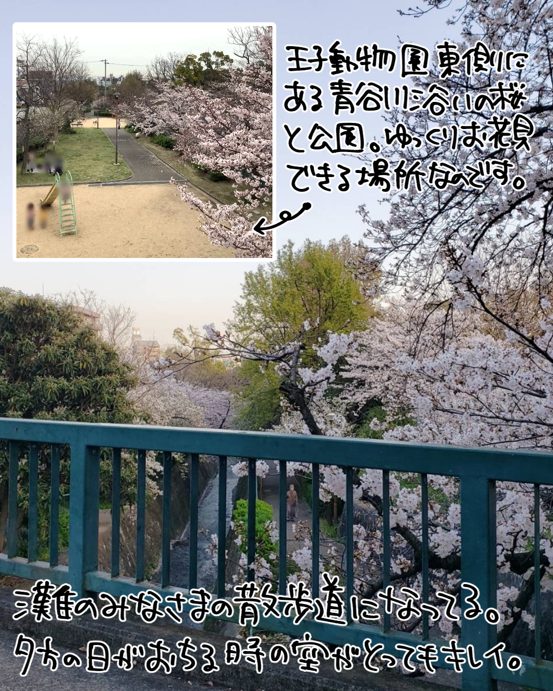 また、王子動物園近くにある青谷川沿の公園の桜も見事。