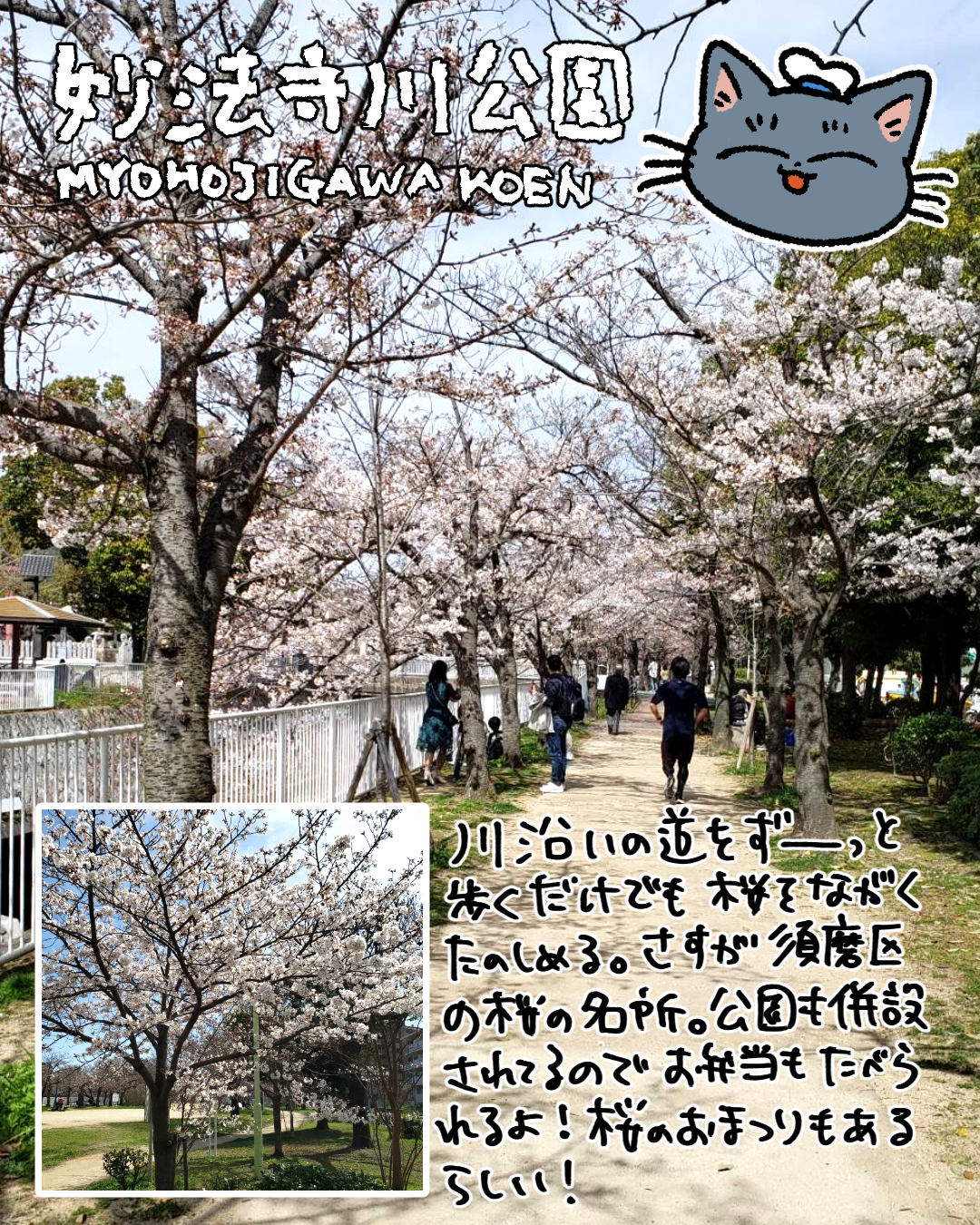 山陽東須磨駅から歩いていける(多分ほかのとこからも行ける)妙法寺川公園もたくさんの桜を楽しめる所です。