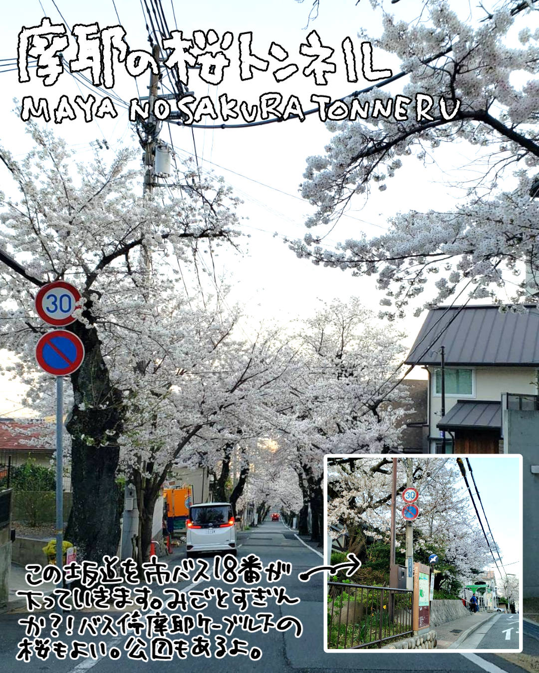 神戸市バスの18番バスに乗るとこの桜トンネルを下っていくので、バスでお花見を楽しるんですよね〜